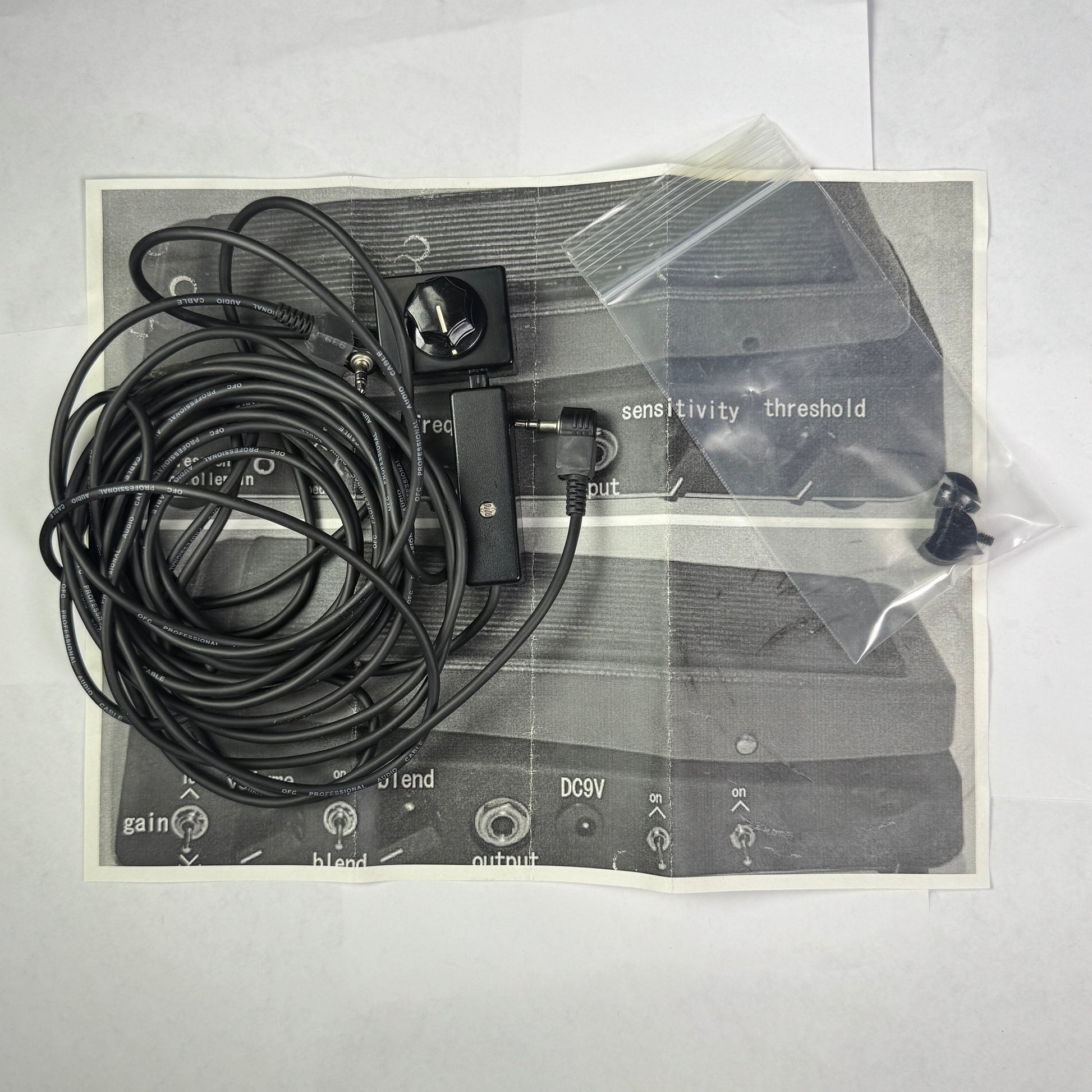 Pretty Rare September Sound Fuzz/Wah with a LOAD of controls including, fuzz, wah/envelope filter, with: High gain, low gain, clean blend, sensitivity and threshold, frequency. Comes with expression device that attaches to your guitar For changing the frequency of the envelope filter.